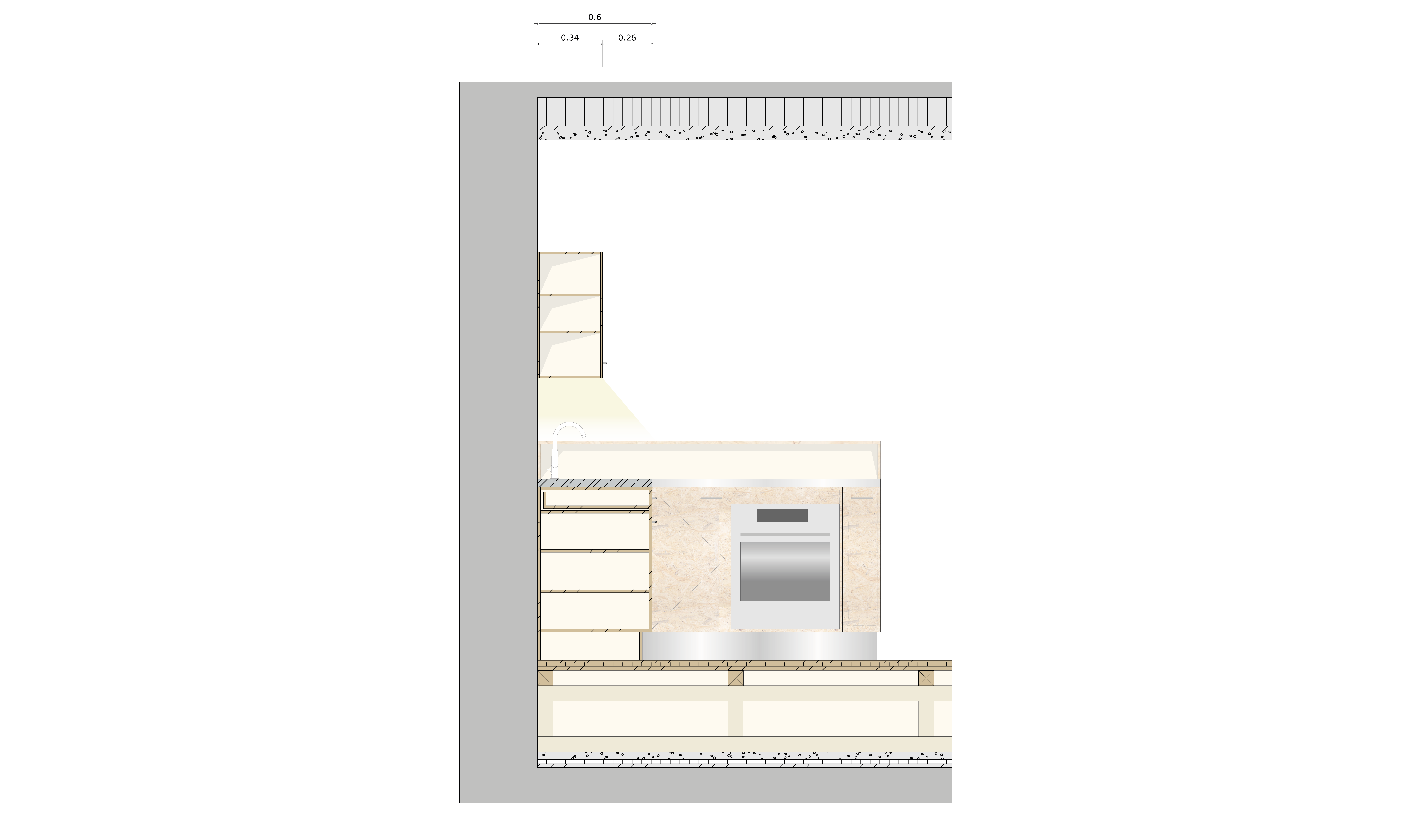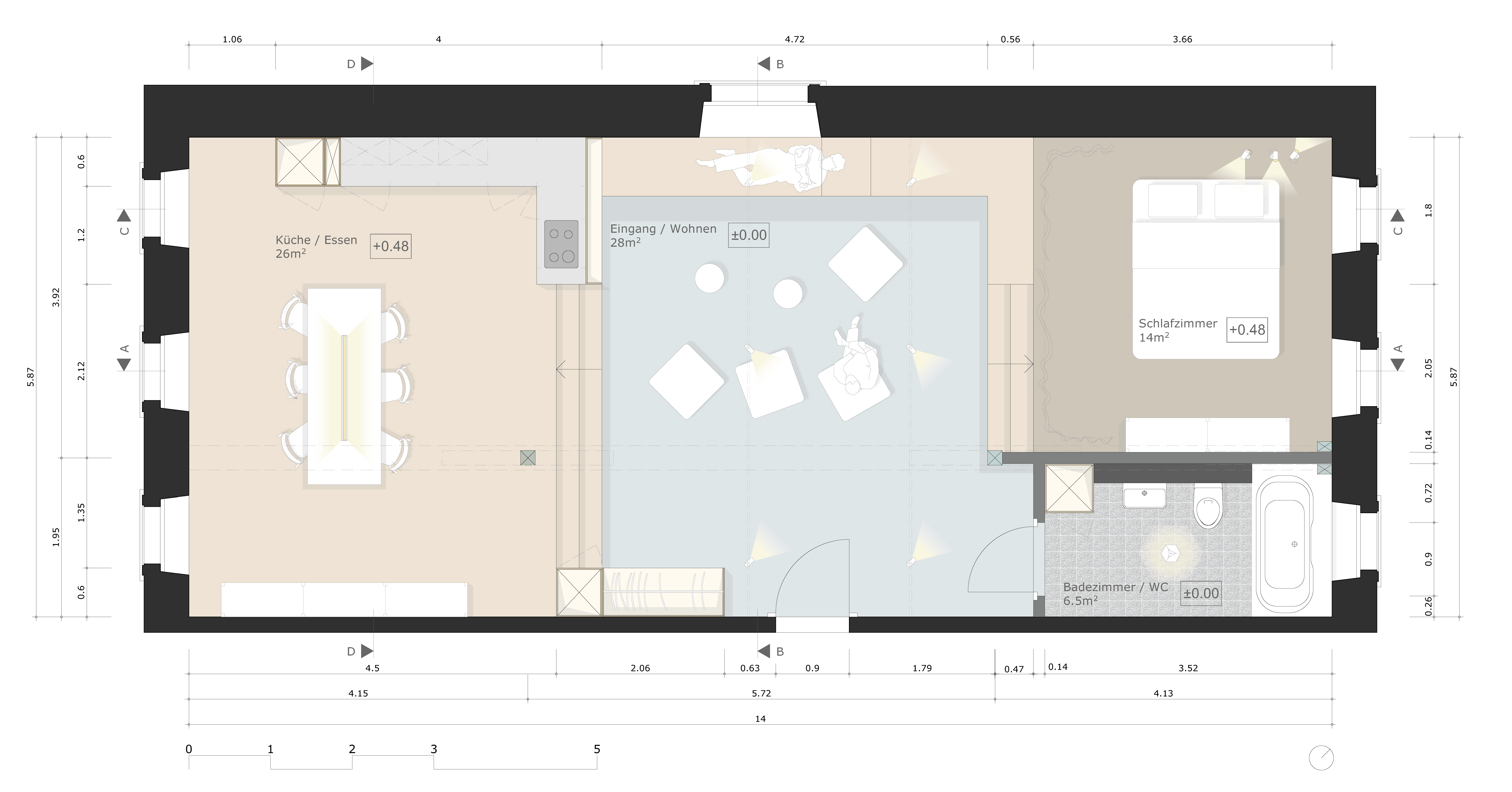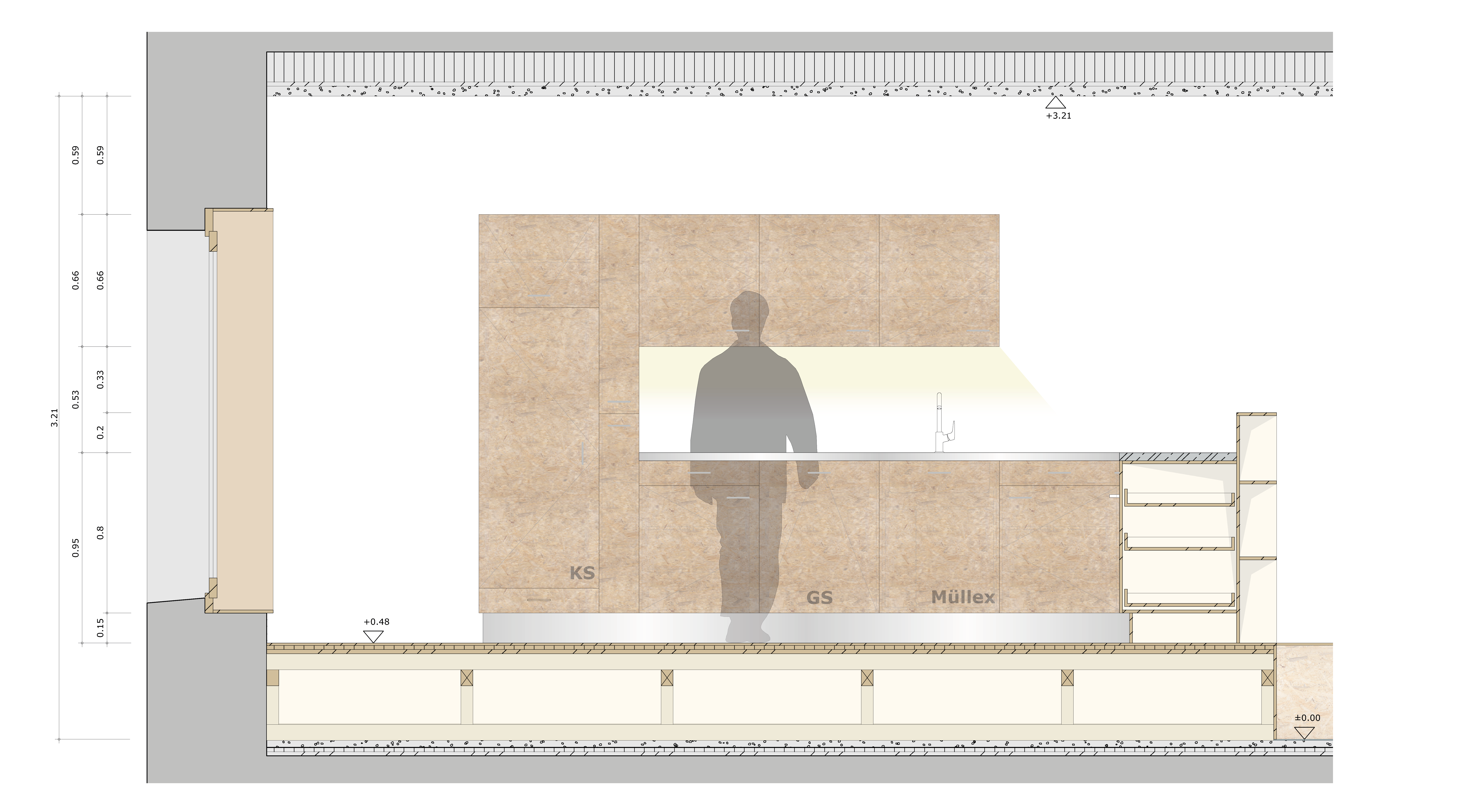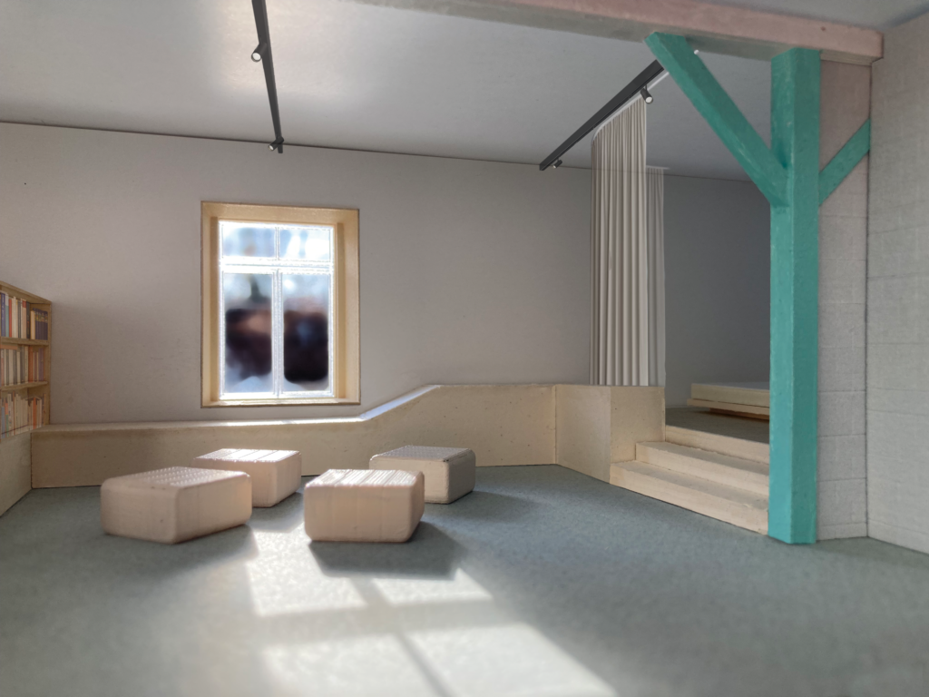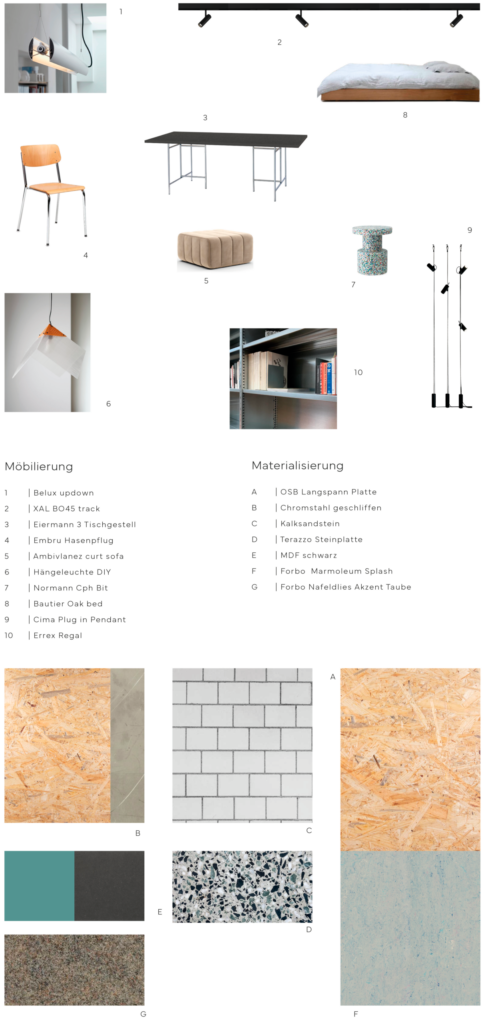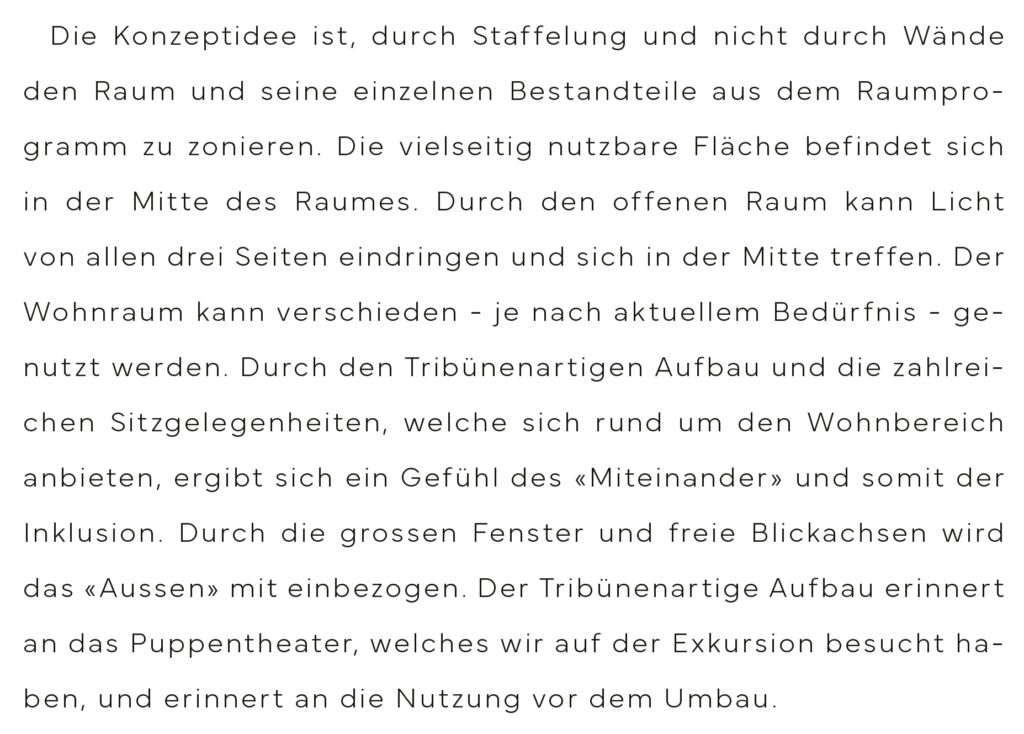 Der Entwurf sieht eine offene und inklusive Wohnform vor. Das offene Wohnzimmer kann dabei zum Veranstaltungsort umfunktioniert werden und schliesst die anderen Bewohner des Hauses mit ein. Der Innenausbau ist an den Nonkonformismus der 80er Jahre angelehnt und setzt ein Statement bezüglich Wohnform und Einstellung.