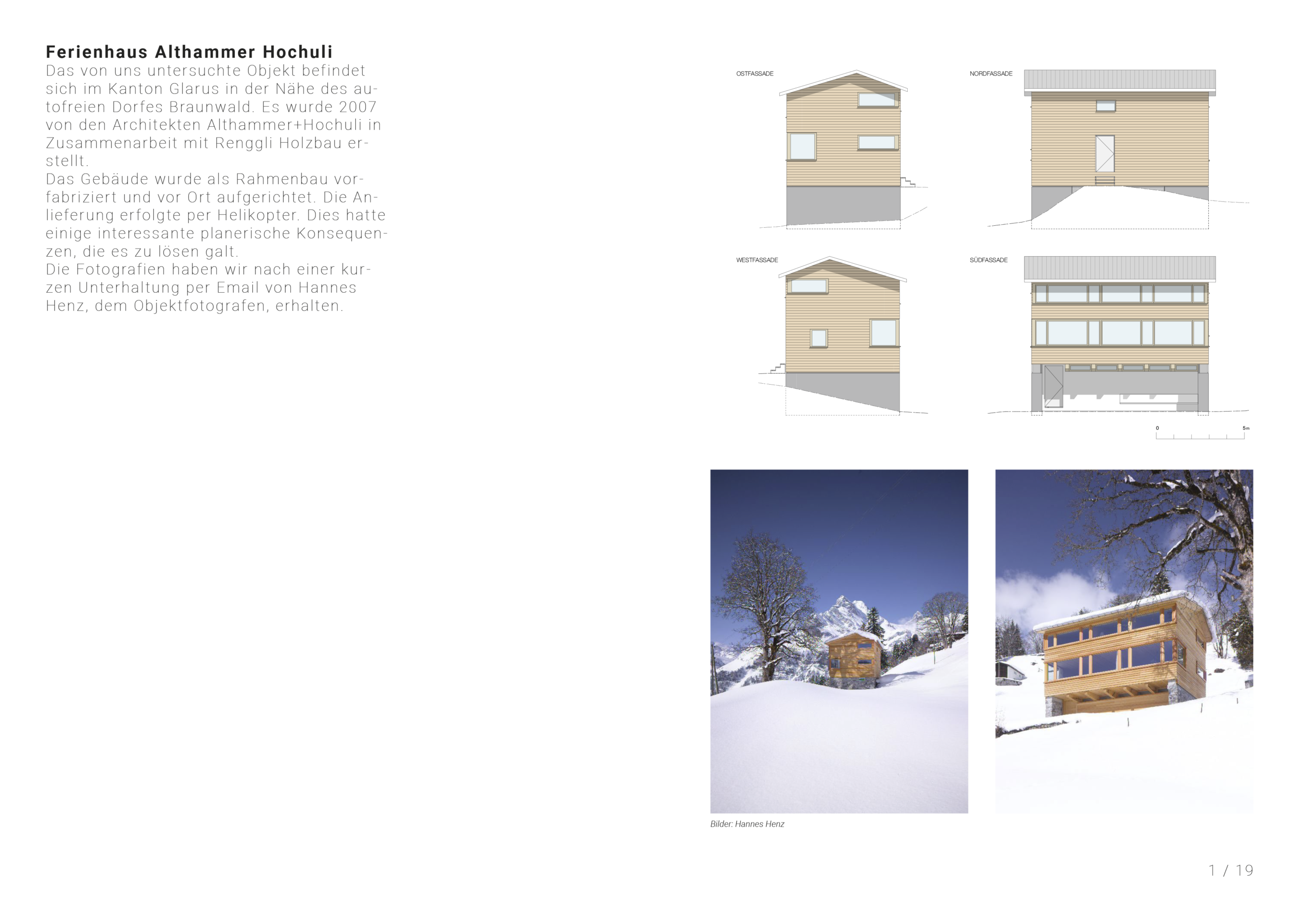 Das Ferienhaus Hochuli geplant von Althammer Hochuli Architekten entstand zwischen 2004-2007 am Oberschwändiberg in Braunwald, Glarus. Der Bau befindet sich an einer südlichen Hanglage und erstreckt sich über drei Geschosse. Im Modul befasste sich die Gruppe intensiv mit der Rahmenbauweise, derren konstruktiven Details und den Lastabträgen des Gebäudes. Inspiriert durch die Auseinandersetzung mit dem Gebäude entstand im Anschluss und ebenfalls im Rahmen des Moduls das Möbelstück «Beby».