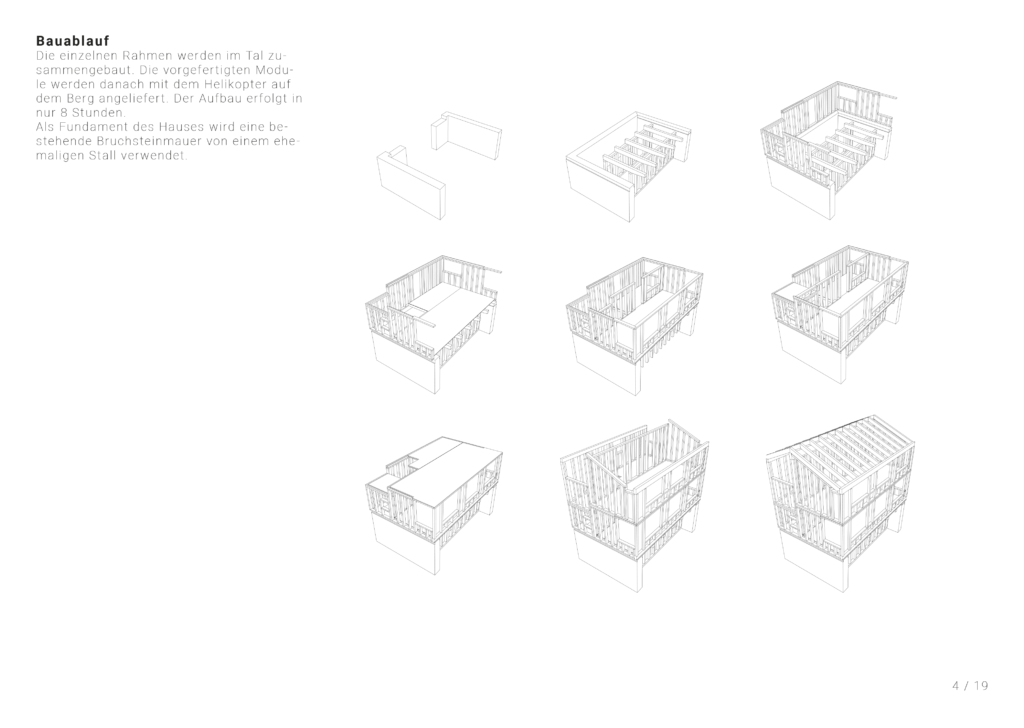 The Hochuli holiday home, designed by Althammer Hochuli Architects, was built between 2004 and 2007 on the Oberschwändiberg in Braunwald, Glarus. The building is situated on a south-facing slope and comprises three storeys. During the module, the group engaged intensively with the frame construction, its structural details and the building’s load-bearing systems. Inspired by their examination of the building, the piece of furniture ‘Beby’ was subsequently created, also as part of the module.